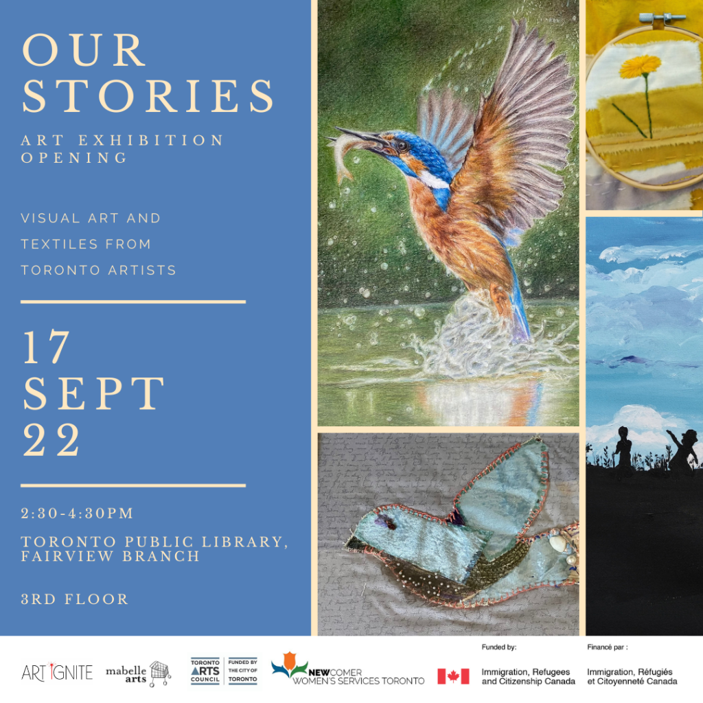 Join us for the free public opening of Our Stories on September 17, 2022 from 2:30-4:30pm at the Toronto Public Library, Fairview Branch (35 Fairview Mall Drive). The exhibition will be located on the 3rd floor of the library, with an artist meet and greet on the 1st floor.